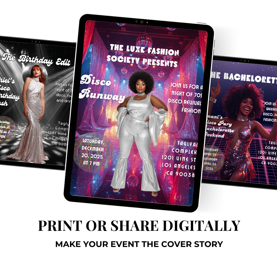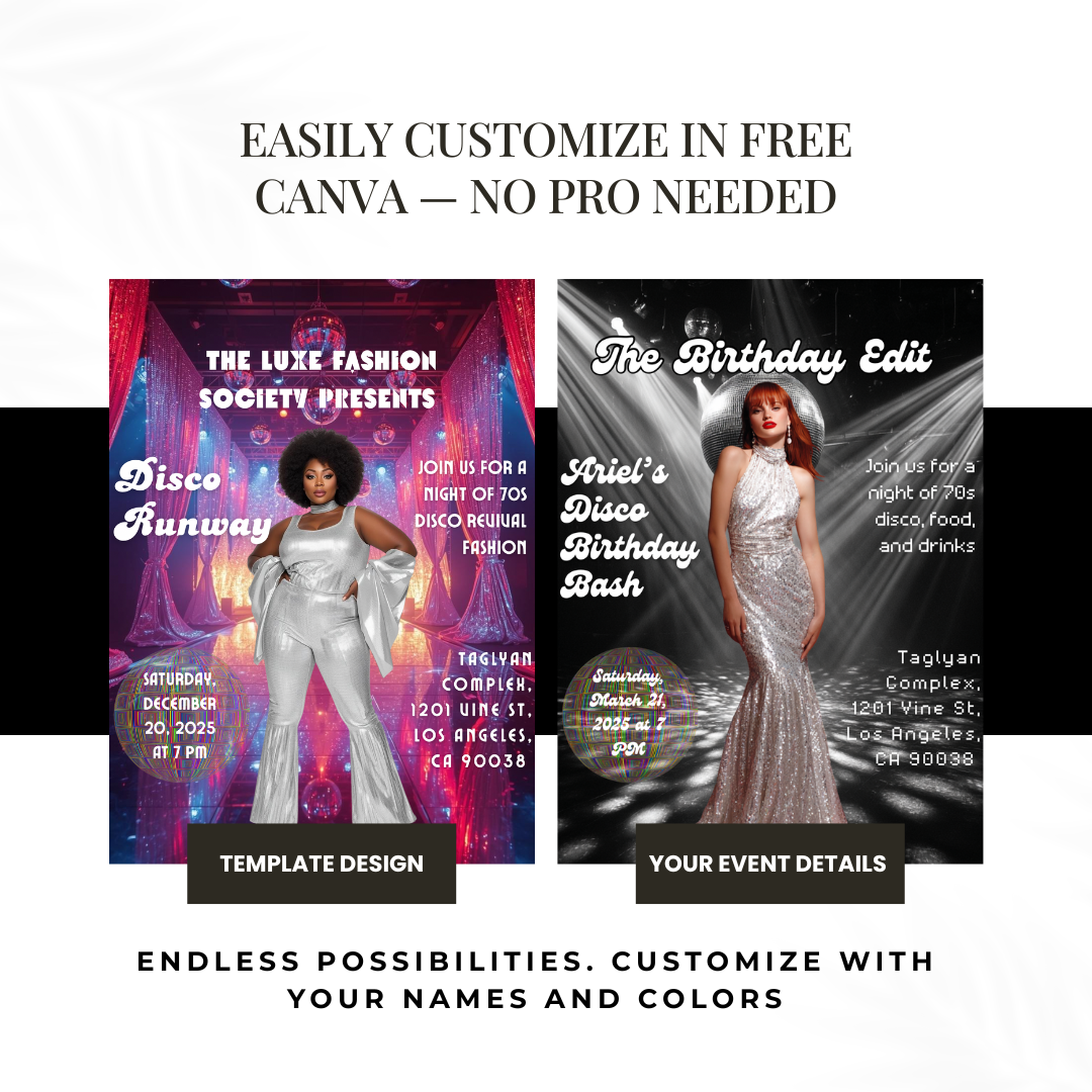 Disco Runway Flyer Canva Template | 70s Fashion Show Invitation | Retro Disco Party Flyer | Editable Event Flyer for Runway & Boutique Shows