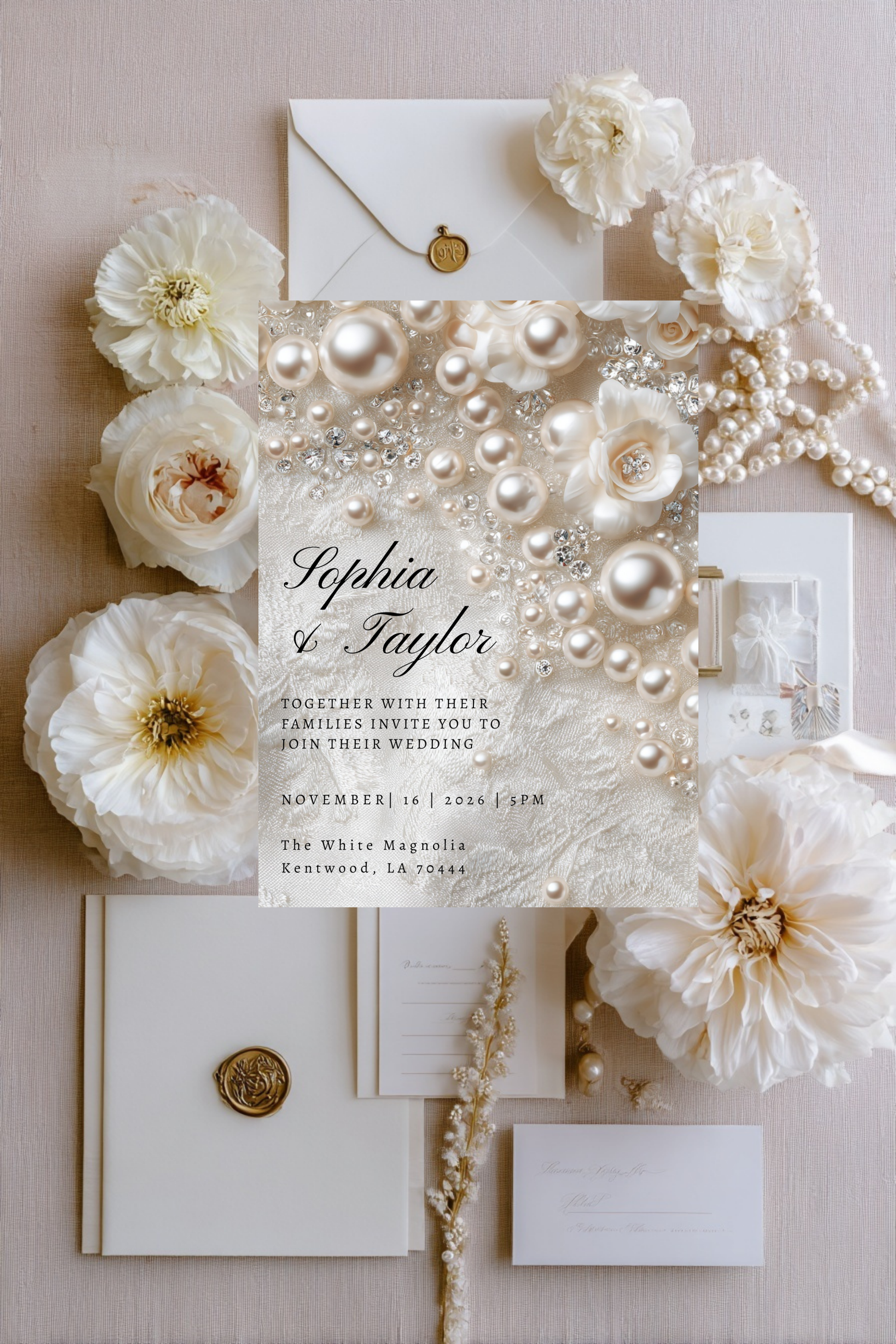 Soft, scattered pearls and a shimmering backdrop create a romantic invitation that feels straight out of a Pinterest wedding board. Ideal for brides who want a dreamy, whimsical aesthetic with a glamorous touch.