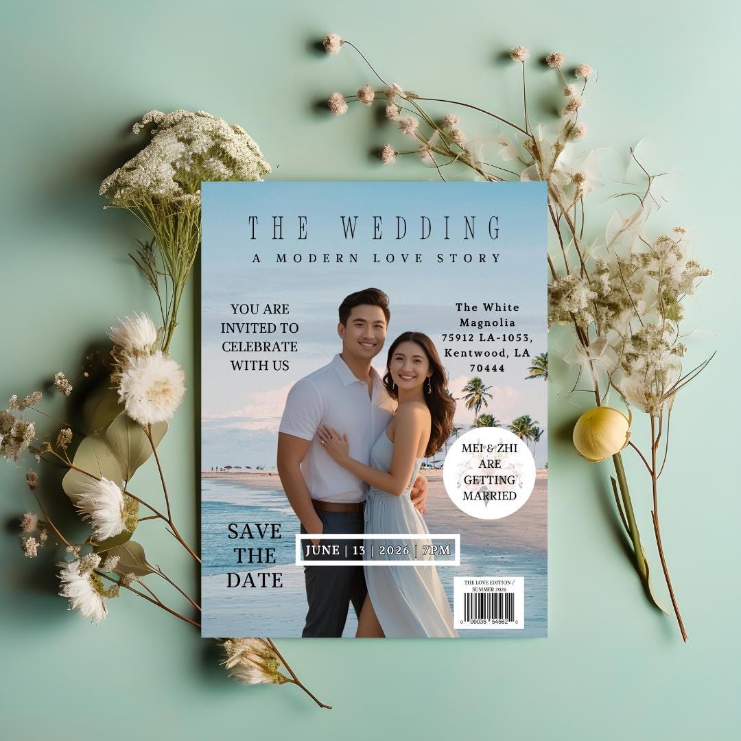 Turn your love story into a cover-worthy moment with this magazine-style wedding invitation. Designed to look like the front page of a modern editorial spread, this Canva template blends the elegance of a formal invitation with the fun and flair of a Save the Date. Featuring a full photo layout, headlines, and stylish typography — it’s perfect for fashionable couples, engagement shoots, or contemporary weddings.