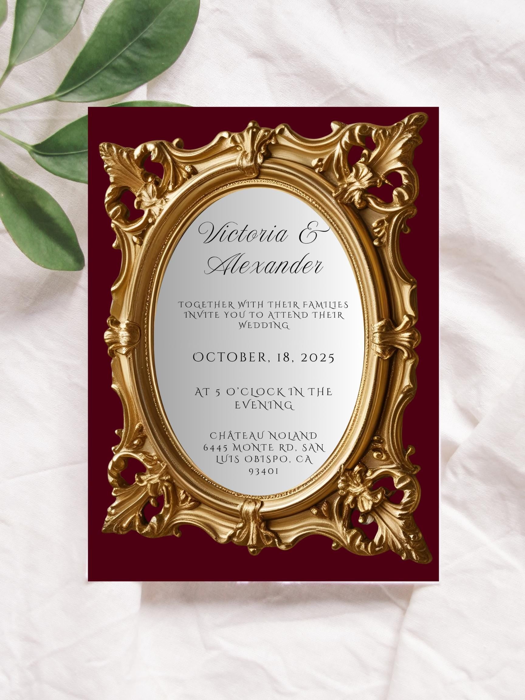 Make a statement from the very start. This ornate gold mirror wedding invitation template is designed for couples who crave elegance, glamour, and something completely unique. With a luxurious baroque-inspired frame and reflective style, its perfect for vintage, royal, or red carpet-themed weddings.